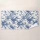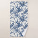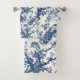 Elegante toalla de baño estilo toile francés azul y blanco con pavos reales sobre ramas.