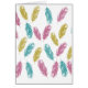 Patrón de plumas en verde azulado, magenta, amarillo dorado sobre fondo blanco.