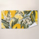 Exquisito patrón con bergamota amarilla, ramas de cítricos con flores blancas y hojas verdes sobre un fondo azul. Elegante patrón de superficie de verano