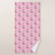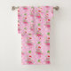 Navidades rosas flamencos con luces de cuerda y un sombrero de Santa sobre un fondo rosa con copos de nieve y palmeras decoradas con gusto. Se muestra aquí en un juego de toallas de baño personalizado. Puede cambiar fácilmente el tamaño del patrón a su preferencia y seleccionar su color de fondo favorito en cada toalla. Añade tu propio mensaje si quieres. Es un bonito motivo para decorar un cuarto de baño con un ambiente de Navidad tropical.