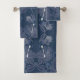 Este producto presenta un patrón floral único de flores de hibisco con follaje sobre fondo azul.