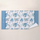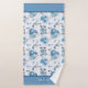 Aquí encontrarás un juego de toallas con un toque floral rosa de color bonito en tonos azules y grises sobre un fondo blanco. La toalla de baño tiene el patrón en el centro, con bordes azules a juego en cada extremo. El borde inferior tiene su monograma en azul, con el nombre escrito en blanco sobre él. La toalla de mano tiene una pancarta circular con tu monograma. El paño de lavado tiene el patrón solo.