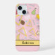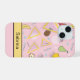 Personalice este estuche para iPhone impreso con un colorido patrón de estilo de fruta abstracta y memphis sobre rosa y amarillo. Simplemente edite el texto del nombre. Elija entre dos estilos para Apple iPhone 15 o una variedad de otros modelos de teléfono en el menú desplegable.