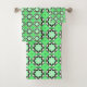 Juego de toallas verdes con un patrón geométrico repetitivo de formas negras y blancas sobre un fondo verde sólido. Incluye vistas colgadas y dobladas.