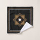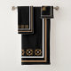 Este juego de toallas de baño tiene un diseño geométrico contemporáneo. Sobre un fondo negro, el diseño se compone de cuadrados y diamantes negros y marrones. Puede personalizar del color de fondo. El paño de lavado, la toalla de mano y la toalla de baño pueden comprarse como un conjunto o de forma individual