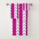 Juego de toallas de baño de patrón geométrico rosado y blanco de rayas de chevron. Este diseño presenta rayas verticales rosas y blancas y un patrón de rayas horizontales de chevron color azul marino.
