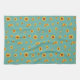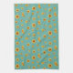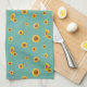 Toalla de cocina con girasoles. Las flores amarillas y los tallos verdes de salvia forman un patrón soleado en las toallas azul turquesa.