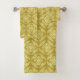Toalla ambientada en un clásico patrón de kimono japonés de hojas estilizadas, de cuatro vías, medallones de hojas y flores de amarillo claro sobre un fondo mostaza profundo / amarillo dorado
