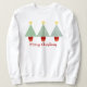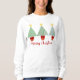 Patrón moderno Camisa de Navidad Feliz. Cuenta con tres árboles de Navidad - uno es verde con puntos blancos, uno es verde y con rayas blancas, y uno es verde en cheques blancos. Cada una está coronada por una brillante estrella y en macetas de arcilla con un arco de cinta roja. Diseño minimalista, Feliz Navidad está en la tipografía de escritura. Se pueden personalizar las palabras navideñas más feroces.