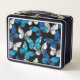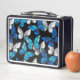 Mariposas realistas, azules y blancas, sin fisuras en el fondo negro.