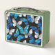 Mariposas realistas, azules y blancas, sin fisuras en el fondo negro.