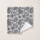 Toalla colocada en un adorno paisajístico ornamentado en tonos de gris medio a oscuro, negro y blanco, sobre un fondo gris plateado medio