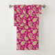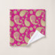 Toalla colocada en un adorno paisley ornamental en gradientes de oro con un aspecto falso metálico, sobre un fondo rosa fucsia profundo