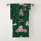 Añada un toque personalizado a su decoración de vacaciones en casa con este juego de toallas de baño de temporada de Feliz Navidad. Las toallas tienen coches rojos, regalos, nieve, árboles y copos de nieve blancos. El fondo es verde. El texto del personalizado puede ser editado por tu preferencia y actualmente dice "¡Feliz Navidad!" Este bonito juego de toallas de baño también hace un gran regalo personalizado a los Navidades.
