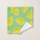 Patrón sin fisuras dibujado a mano con limones en amarillo, negro y crema sobre fondo verde.