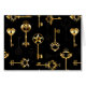 Patrón incomparable de llaves antiguas, doradas y de silueta sobre fondo negro.