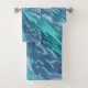 Set de toallas de baño de 3 accesorios de decoración de baño con diseño de arte del patrón X turquesa de punto por TheFabricSeal | Zazzle. Este hermoso diseño de patrones x tiene cuatro secciones de imágenes espejadas y patrones repetitivos coloreados en la playa de las islas tropicales del Mediterráneo y el Pacífico Sur y colores inspirados en el agua del océano. Colores en tonos azules, turquesa, azul, verde, turquesa, violeta, plateado y gris. Este diseño complementa nuestro otro diseño titulado Patrón de repetición turquesa X punteado para mezclar y hacer coincidir productos juntos.