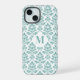 Damasco decorativo en un patrón de influencias vintage, con detalles de color verde azulado en un color de fondo de su elección, con centro de letras para personalizar.