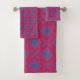 Disfrute de esta toalla de baño en diferentes patrones de círculos, cuadrados y estrellas en gradientes desde el color del año 2023 Viva Magenta a Delft. Cambie la ubicación de los patrones por sí mismo, utilizando la opción "Editar diseño".