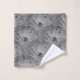 Un elegante patrón de plumas de pavo real hecho en un purpurina plateado con un fondo gris.