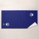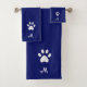 Pata mascota y monograma sobre conjunto de toallas de baño azul marino. Elegante y sencillo diseño para los amantes de las mascotas.