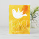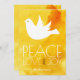 Paz, amor y alegría acuarela amarilla y tarjeta plana de vacaciones de Navidad de paloma. Esta tarjeta festiva de moda cuenta con una paloma blanca con ojo dorado y el texto “Paz, amor y alegría” sobre fondo de acuarela amarilla y naranja.