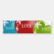 Pegatina para el parachoques adaptable de los días de fiesta con las bolas azules, rojas y verdes del navidad con los copos de nieve y el lema - paz, amor, alegría.