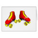 Un par de pcteres de ruedas rojos con los cordones amarillos. Usted puede cambiar el color de fondo o añadir el texto durante pago y envío.
