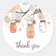 Peach y Gold Mason Jars Spring Gracias Pegatina Gracias pegatina que presenta jarras de albañil, flores, pájaros de amor y cuerdas de corazón - tierno y caprichoso, perfecto para celebraciones de primavera y al aire libre.