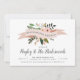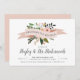 Celebra tus mejores chicas con estas invitaciones de brunch de las damas de honor de la moda. El diseño presenta una cinta rosa de color rosa que lleva las palabras "brunch de damas de honor" con flores de melocotón y hojas verdes que asoman. Personalice con sus detalles de brunch en serif de color negro oscuro y letras de caligrafía.