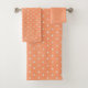 Se trata de una tonalidad versátil y agradable de salmón pálido, un naranja suave de tendencia que se complementa con muchas combinaciones de colores. El color cremoso de los sabores naranjas combina con la paleta de la pintura de Benjamin Moore "Peachy Keen". Patrón de puntos de polka impresos a mano blanquecinos sobre el fondo de un naranja peachy