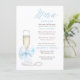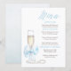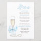This adorable vintage chic menu design reflects modern elegance and timeless charm, featuring a romantic dusty blue bow and a prosecco glass with white pearls nearby.