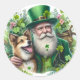 Dulce imagen de un duende sosteniendo un perro, se presenta en esta pegatina redonda para el Día de San Patricio. Esta pegatina se puede utilizar para envíos del Día de San Patricio, decoración, scrapbooking y más.