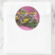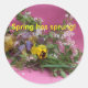 pegatina, grande de 3 pulgadas, rosa con flores primaverales en letras amarillas, azules, blancas y amarillas: "¡La primavera ha brotado!"