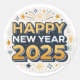 La pegatina presenta un diseño festivo y colorido para celebrar la llegada del año 2025. En el centro, la frase "Happy New Year 2025" está escrita en letras grandes y alegres, con un estilo tipográfico moderno y brillante.
