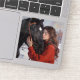 A serene winter scene captures a tender moment between a young woman and her loyal horse. Clad in a warm red coat, she gently rests her forehead against the horse’s, their breath mingling in the crisp, snow-filled air. The golden hues of the background contrast with the falling snowflakes, evoking a sense of peace, trust, and quiet companionship in nature’s embrace.