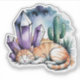 A gorgeous cat sleeps in the desert with amethyst crystals and cactus in the desert