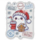 Un encantador personaje fantasma vestido con un acogedor sombrero de Santa Claus acoge una bebida festiva y una casa de jengibre, rodeados de pegatinas de temática lúdica y Navidad. Los copos de nieve caen alrededor, lo que crea un ambiente caprichoso ideal para las vacaciones.