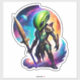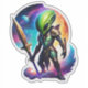 Un caballero alienígena verde armado sostiene una espada brillante, ambientado sobre un fondo cósmico.