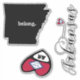 Una hoja de 3 pegatinas diferentes, con diseños de Arkansas. Cada pegatina está cortado y se puede eliminar por separado, de modo que se puede pegar en diferentes elementos. Diseño 1: Corazón con la bandera del estado y abreviatura del estado. Diseño 2: Tipo de letra con guiones y el indicador de estado se mezclan en un corazón. Diseño 3: Mapa de estado con el texto 'pertenecer a (H)'. Si te gusta el estado, ¡estos son geniales para mostrar ese amor, pegándolos en tu auto, laptop, teléfono, ventana o cualquier otra superficie lisa!