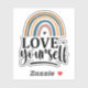 Eleva tu rutina de autocuidado y adopta el poder del amor propio con este hermoso pegatina de "Amate a ti mismo" con cerebro y corazón de Sexy Frogs Design. Diseñado para inspirar y motivar, este pegatina es un recordatorio diario para priorizar su bienestar y nutrir su yo interior. Póngalo en su portátil, en su botella de agua o en su asiento para infundir su entorno con positividad. Con sus colores vivos y su material duradero, este pegatina es a la vez elegante y duradero. Que sirva como una señal visual para practicar el autocuidado, practicar el amor propio y crear una vida llena de felicidad y satisfacción