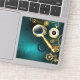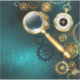 Una lupa antigua con mango dorado y lente convexa sobre el fondo verde con los engranajes dorados y un reloj antiguo. Estilo Steampunk.