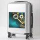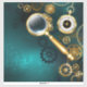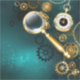Una lupa antigua con mango dorado y lente convexa sobre el fondo verde con los engranajes dorados y un reloj antiguo. Estilo Steampunk.