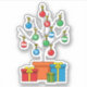 Un ilustracion de un simple árbol de Navidad con ramas desnudas con bolas colgantes y regalos coloridos. Celebremos y estemos alegres en esta temporada navideña con buenas comidas y hermosos regalos para la familia y amigos.