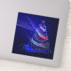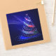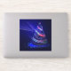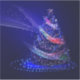 Árbol de Navidad SlipperyJoe digital cintas rojas verdes azules translúcidas que brillan con energía festiva círculos concéntricos de luces azules hacia afuera presencia etérea casi holográfica luces radiantes y destellos fondo azul profundo regalos de orgullo gay atmósfera mágica emite rayos estelas de luz movimiento y flujo LGBTQIA