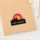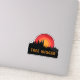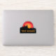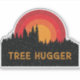 Pegatina colorido para la gente al aire libre, con un amanecer (o puesta de sol) angustiado detrás de un bosque, y las palabras TREE HUGGER.