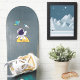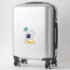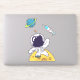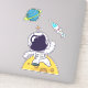Una calcomanía con el ilustracion de un hombre espacial vestido con un traje de astronauta blanco flotando sobre la luna. A la distancia hay un planeta con anillos y un barco con cohetes volando hacia el cielo buscando nuevos mundos para explorar.