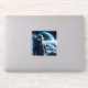 Un astronauta con un traje naranja vibrante se para en la superficie congelada de una luna alienígena, con imponentes formaciones de hielo rodeándolas.