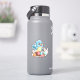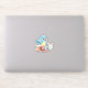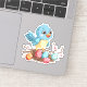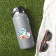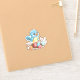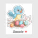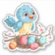 Un bonito pájaro azul se sienta en la extremidad de un florido árbol de primavera mientras los huevos de Pascua coloreados salen de un nido.