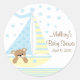 Pegatina lindo de la fiesta de bienvenida al bebé que ofrece una navegación dulce del oso en un velero azul y amarillo. ¡Pegatina perfecto para los favores del bebé o los sellos para sobres de la invitación! Las invitaciones a juego, los sellos y le agradecen observan están disponibles en nuestra tienda en www.celebrateitinvites.com. estudio del ©Cocoa